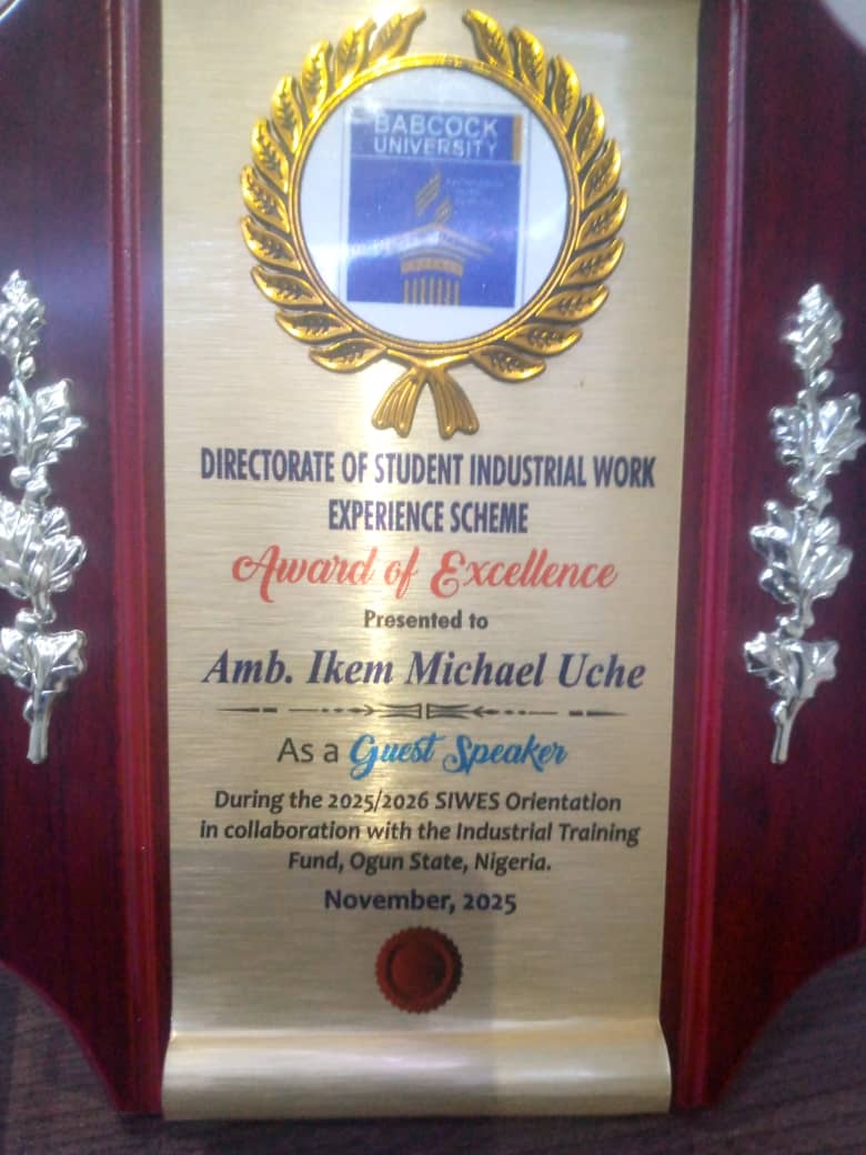 Babcock University’s SIWES Directorate has conferred an Award of Excellence on Ambassador Ikem Michael Uche, Director of ThinkCyber Nigeria, in recognition of his outstanding contributions to industrial training, cybersecurity capacity building, and youth technical empowerment across Nigeria.