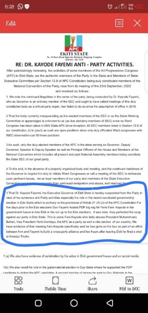 Rising to the occasion to defend his visit, Kayode said via his social media handle “Governor Kayode Fayemi is a loyal member of the APC whilst I am in PDP. Accusing him of “anti-party activities” & attempting to suspend him from his party simply because I visited him to discuss national & SW issues is absurd.”