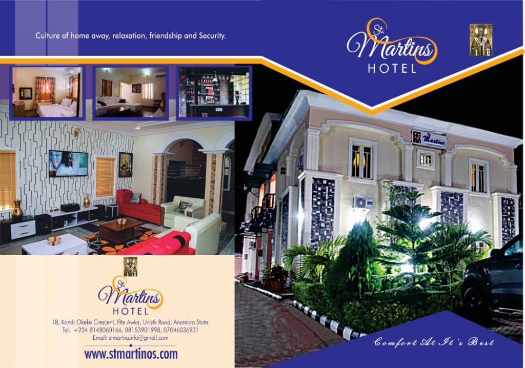 Tucked between the twin cities of Enugu and Onitsha/Asaba, the St Martins hotel is just an hour away from Enugu international airport and about one hour thirty minutes from Asaba local airport in Delta state. This has endeared the hotel to businessmen and politicians/diplomats seeking to do business in the most robust Eastern Nigerian state of Anambra. The hotel has also introduced complimentary Airport pickup from any of the aforementioned airport making is one of the very few that is offering such service in Anambra state. Not only that, the hotel has employed local and international flight booking for their clients making them to be one of the most pampered clints in the Anambra tourism ecosystem.