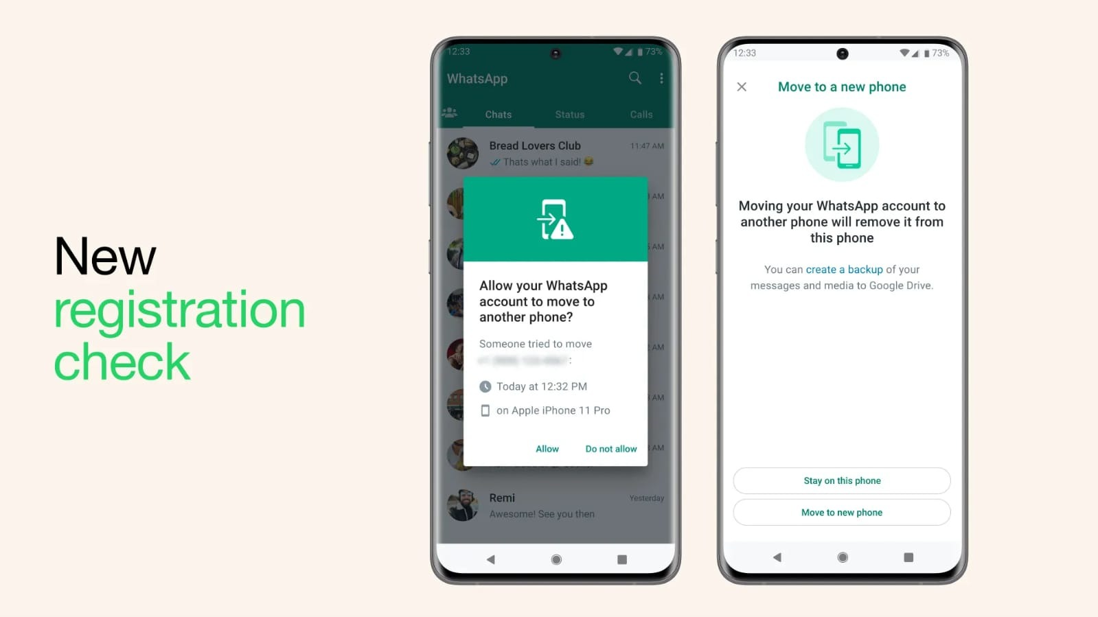 Account Protect: If you need to switch your WhatsApp account to a new device – we want to double check that it’s really you. From now on, we may ask you on your old device to verify that you want to take this step as an extra security check. This feature can help alert you to an unauthorized attempt to move your account to another device.